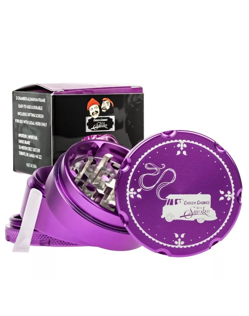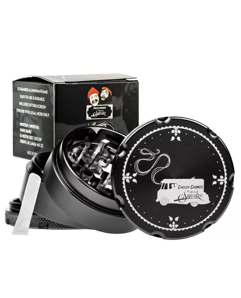 This solid Cheech & Chong 4-part grinder is made entirely out of CNC (computer numeric controlled) aluminum and measures 5 cm / 2 inches across. The pocket size grinder is equipped with sharp, diamond-shaped teeth that effortlessly shred your favorite dry herbs into a fluffy, more manageable consistency.