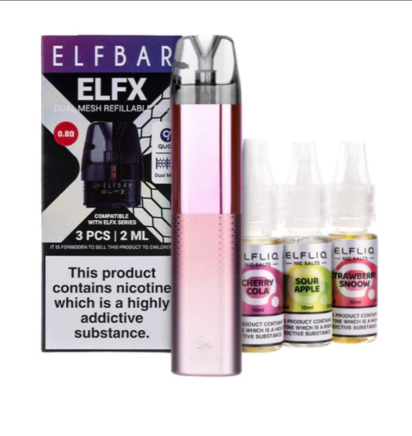 The Elf Bar ELFX is the first refillable and rechargeable pod kit from vaping icons Elf Bar. This streamlined kit is equipped with a huge 1000mAh battery and 30W of variable power. Precise airflow adjustment and a QUAQ Dual Mesh Coil to deliver mouthwatering flavour and a smooth MTL (mouth to lung) style vape. This 30W kit is perfect for lovers of disposable vapes who wish to transition to an economical and easy-to-use refillable kit or anyone looking to upgrade their vaping game.